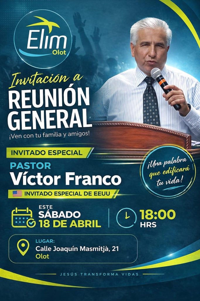 Te invitamos a nuestro culto general este sábado 18 de abril a las 18:00 en nuestra iglesia de Olot.